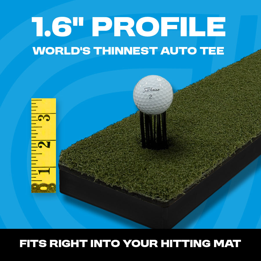 The world’s first and smallest automatic tee stands at just 1.6 inches, designed to drop directly into any hitting mat—no platforms, no digging, no setup required. Its ultra-low profile gives accessibility to more golfers in height constrained setups.